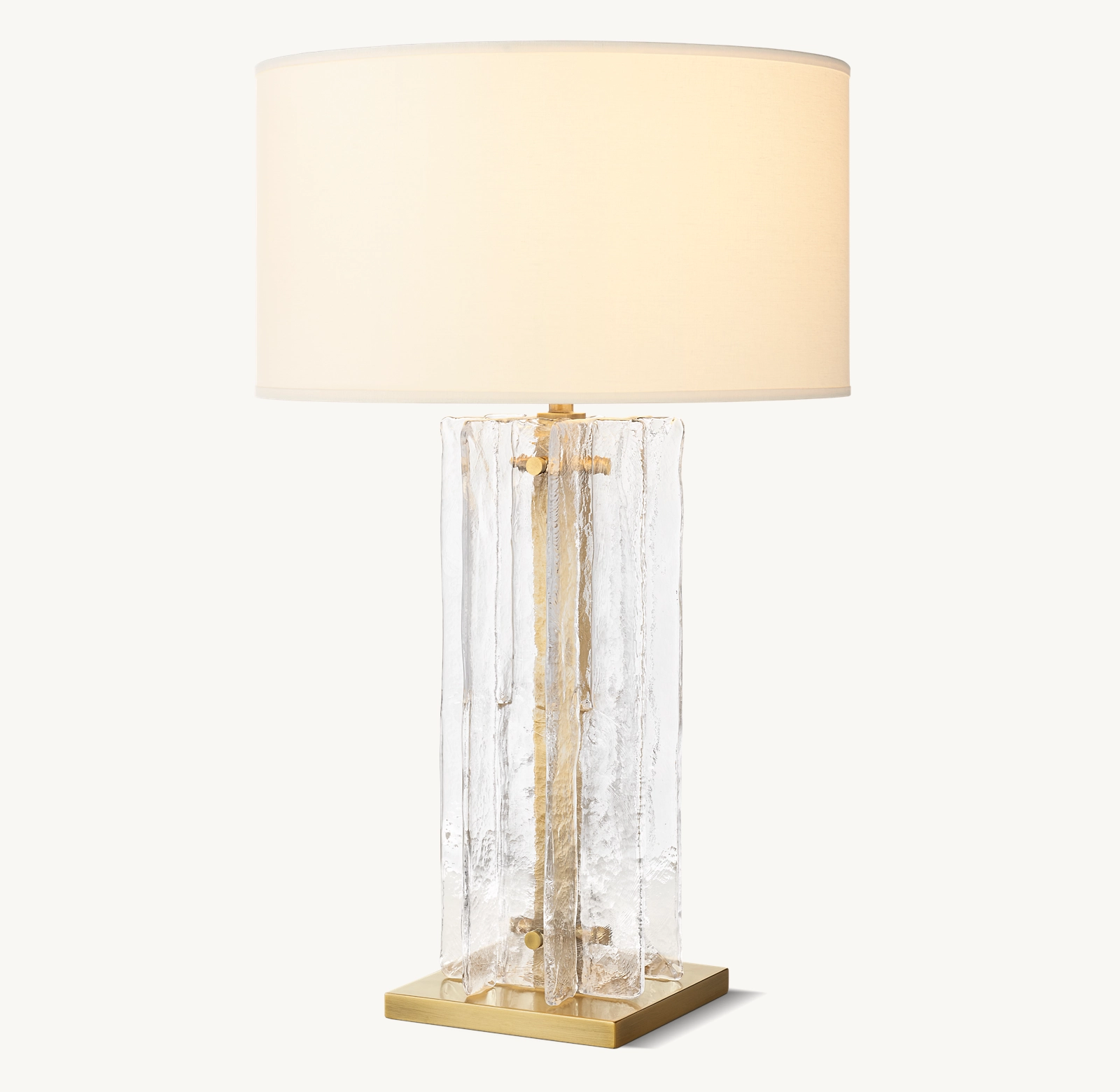 Crafted of solid cast glass, our Kattice collection's interlocking planes recall the geometric precision of the midcentury International Style. A study in repetition and rhythm, the linear form employs open space to lend a weightless feel. Gently rounded corners on the fluid, rippled panes subtly soften the outline, while a linen drum shade diffuses the light within.