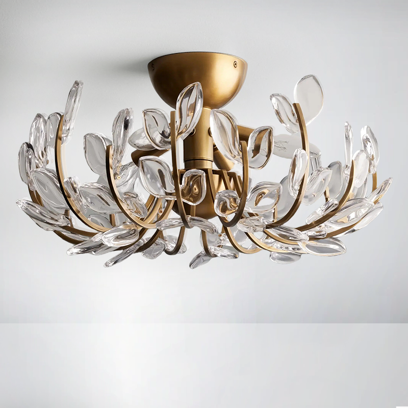 Handcrafted from steel with brass plating, Glelard scatters light through its beautiful glass petals. A lovely statement for any living space, softly sculpted petals create an organic feel, while steel branches secure the canopy and provide structure to the piece.