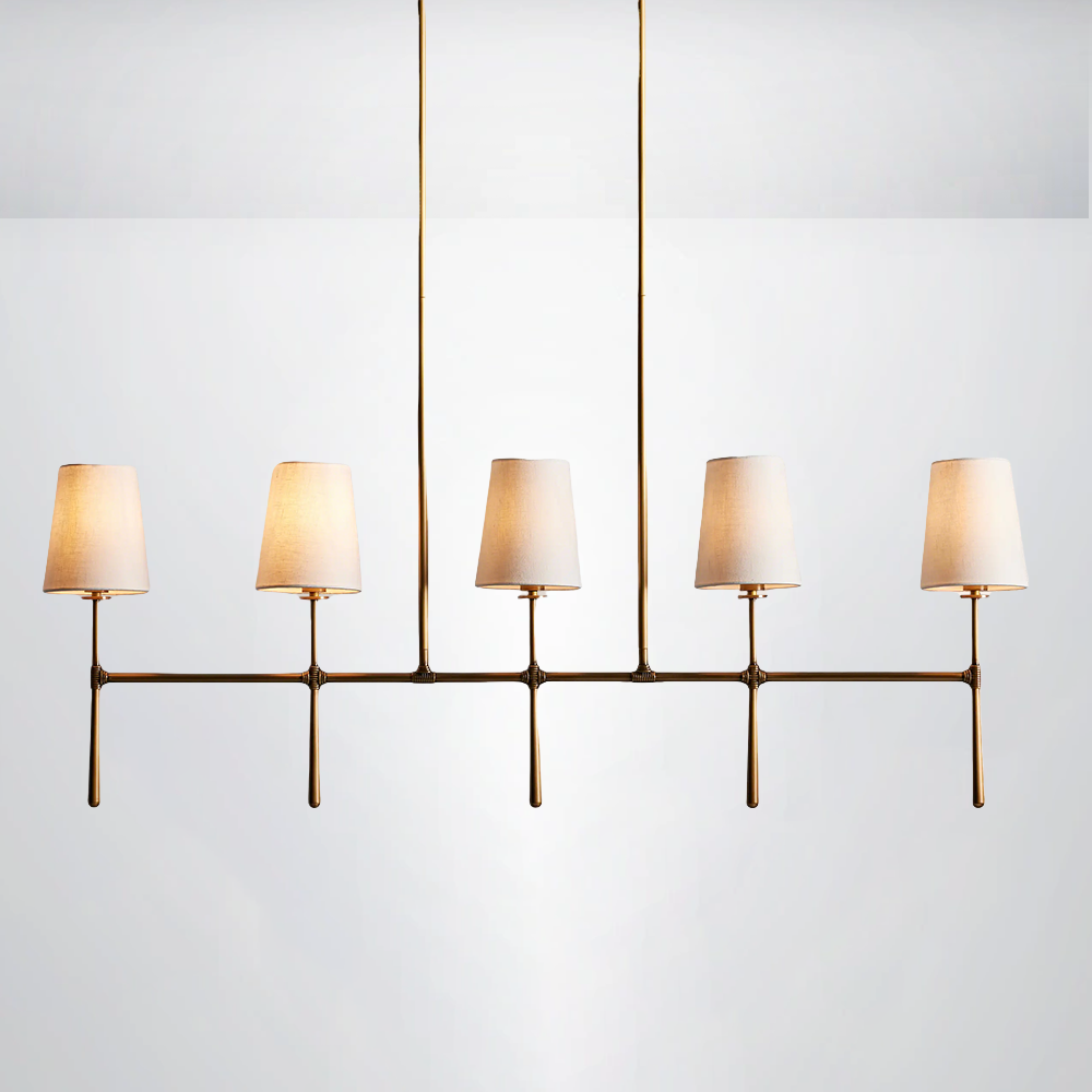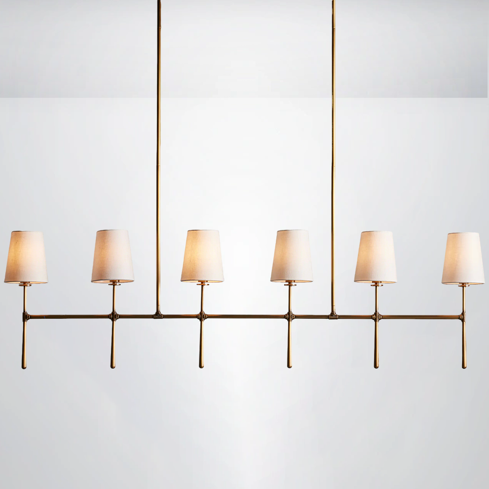 - Crafted from steel with a bronze plated or burnished brass finish and tapered linen shades.