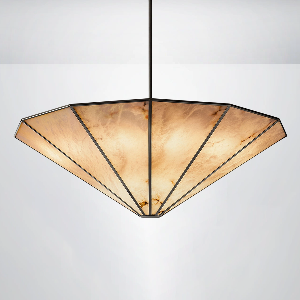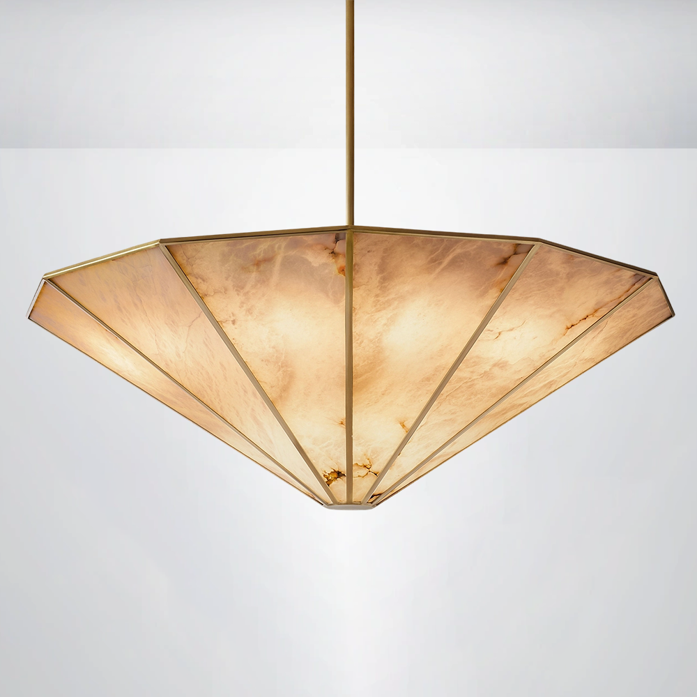 Evoking the refined glamor and bold geometry of Art Deco lighting, Libate by Paris-based architect and designer Poggioli features individually framed solid alabaster panels. A warm glow through the translucent stone highlights the unique veining and coloration of each piece.