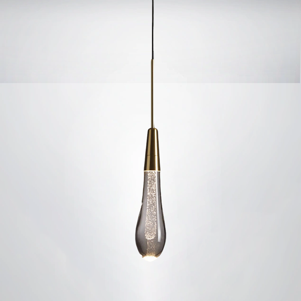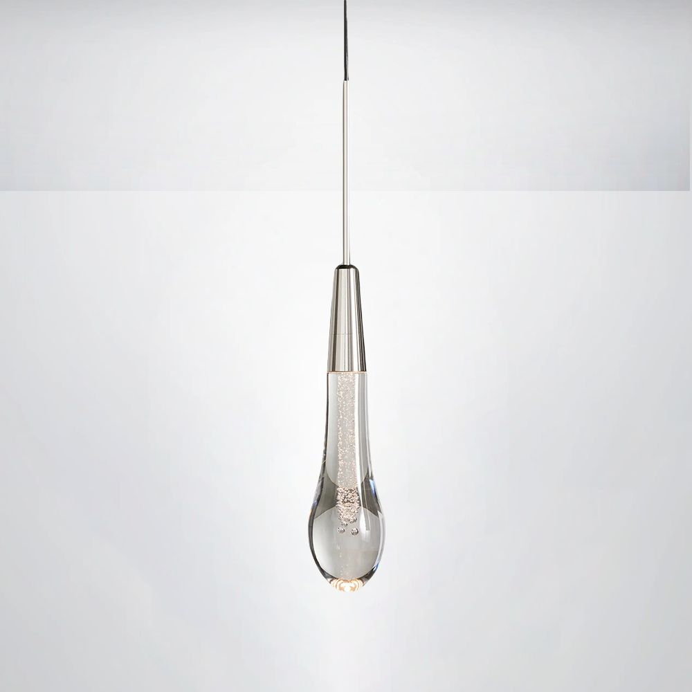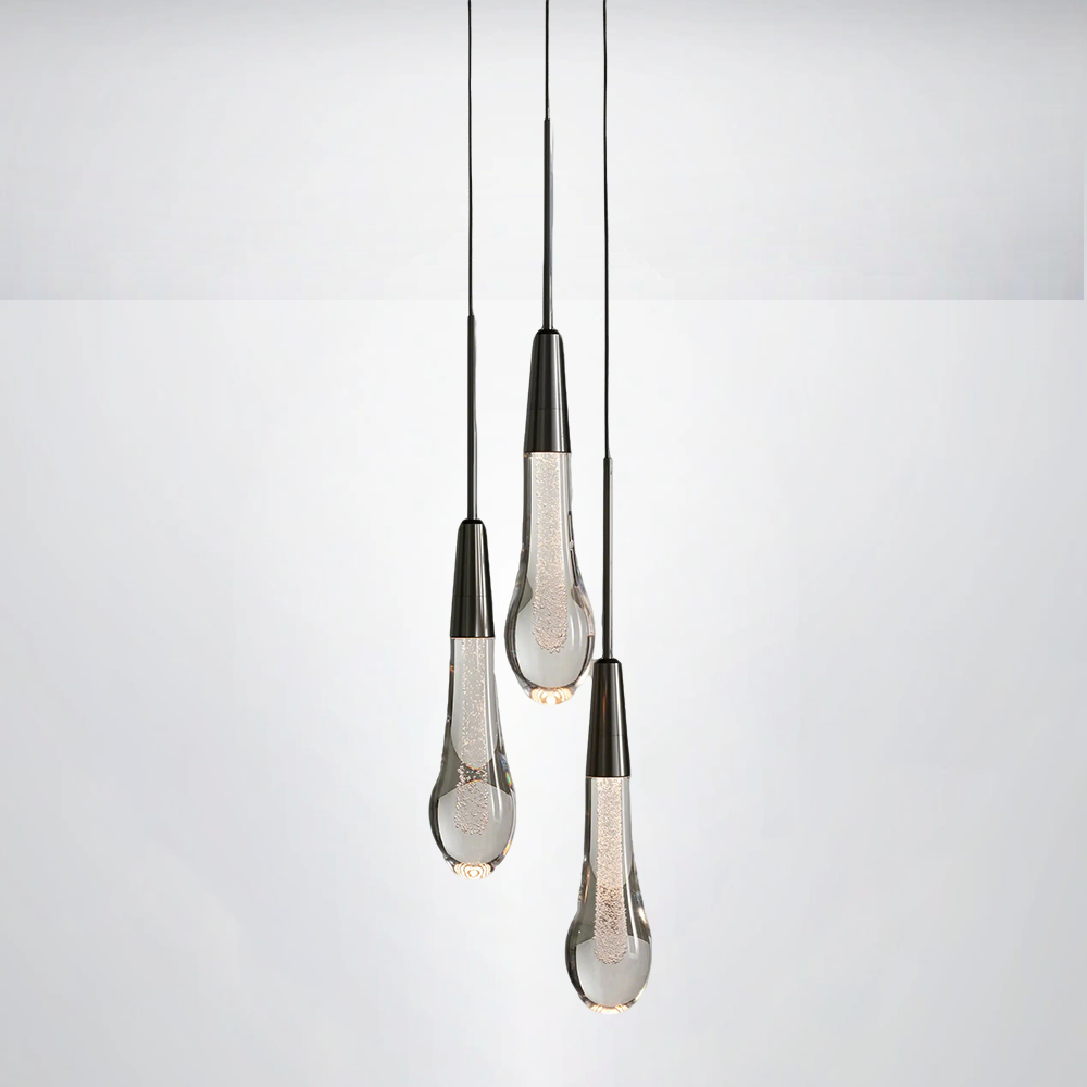Featuring adjustable PVC cords cascading into integrated LED lights handcrafted from seeded glass, this Lighting Collection mimics the look of a fallen raindrop.